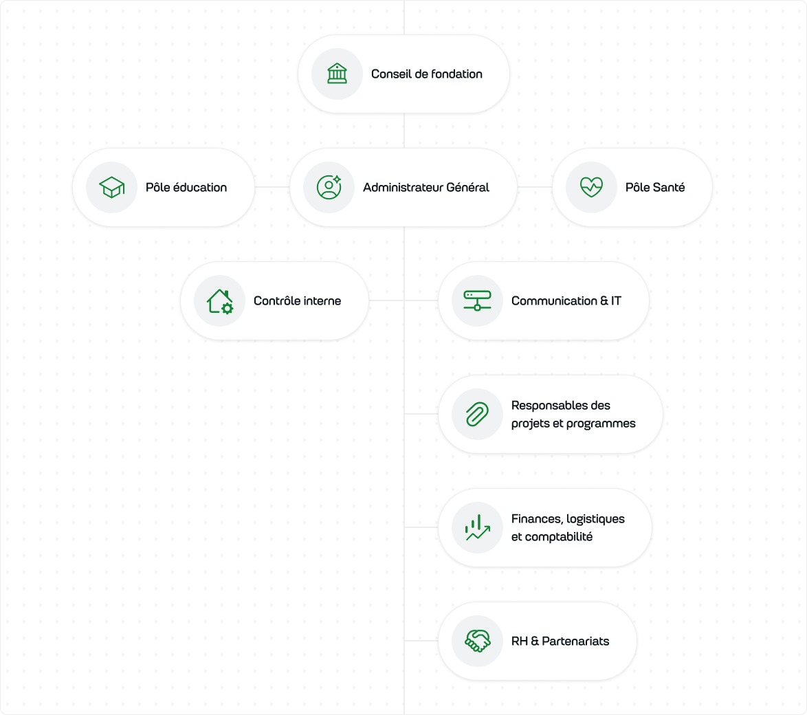 La Fondation s’est dotée d’organes de gouvernance et de contrôle solides. Elle dispose d’un Conseil de Fondation composé de personnalités fortement engagées et sensibles aux questions de vulnérabilité sociale. Ce Conseil fixe les orientations majeures que l’Administrateur Général et son équipe se chargent d’exécuter dans le respect des textes de la Fondation. La gestion de la structure est soumise au contrôle strict de la Cellule de contrôle interne et des commissaires aux comptes qui valident les états financiers et les rapports de gestion.